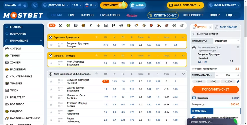 БК предлагает россиянам пари на спортивные события с 2009 года. Компания прошла лицензирование в Кюрасао, а головной офис находится на Кипре. Сайт и мобильная версия для Android и iOS работают на 47 языках, включая русский. В линии Мостбет 30 классических видов спорта, собачьи бега и турниры по популярным видеоиграм – Counter-Strike, Dota 2, League of Legends и Valorant. Редкие категории – фигурное катание, сквош, хоккей на траве, керлинг, кабадди.