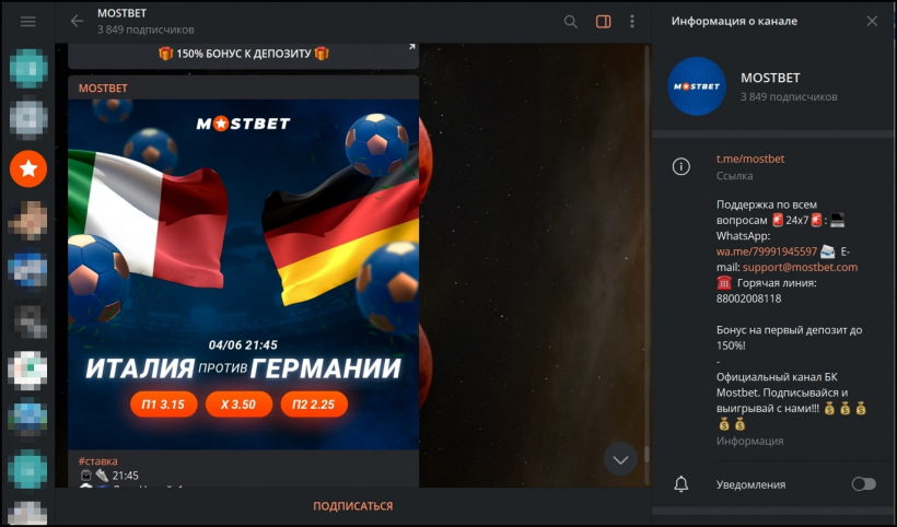У букмекерской конторы «Мостбет» есть еще один телеграмм канал - t.me/mostbet. Этот канал не используется для общения с саппортом, но здесь можно найти множество полезной информации.
